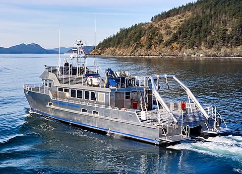 Also installed is a four-extension knuckle crane for loading and discharging the vessel, as well as a moon pool with vertically articulating transducer strut. Wet and dry labs are housed aboard, as well as a 16-foot (4.9-metre) auxiliary boat.