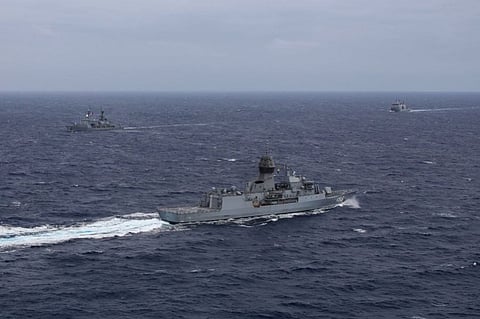 The Royal Australian Navy frigate HMAS Toowoomba conducts a maritime cooperative activity with the Philippine Navy patrol ship BRP Gregorio del Pilar and the landing ship BRP Davao del Sur in the waters of the Philippines' Exclusive Economic Zone, November 25, 2023. (Photo: Australian Department of Defence)