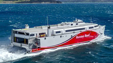 Designed and built by Australia's Incat Tasmania, the all-aluminium Buccoo Reef measures 100 metres long and is capable of speeds in excess of 39 knots. It will carry up to 995 passengers and 239 vehicles on each of two daily trips between Scarborough (08:00 departure) and Port of Spain (16:00 departure) every week from Monday to Friday.