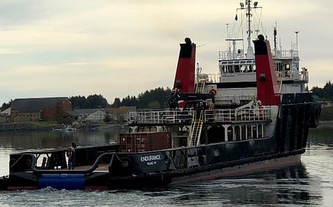 The crew of the salvage tug Endurance (pictured) will use their vessel's sonar and a camera-equipped remotely operated vehicle (ROV) to search for the wreck of the crab boat Scandies Rose, which is believed to have sunk to a depth of 50 metres some eight kilometres off Alaska's Sutwik Island.