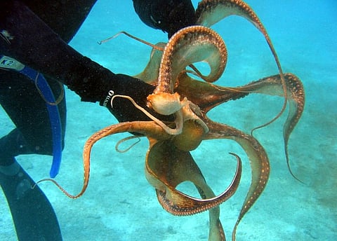 He then coaxed the little octopus out of its hole by offering it the cheese. I recall the octopus was also about a foot long. After stroking it for five or ten seconds he passed the octopus to the diver next to him, who fondled it for a few seconds and then passed it to the next diver and so on.