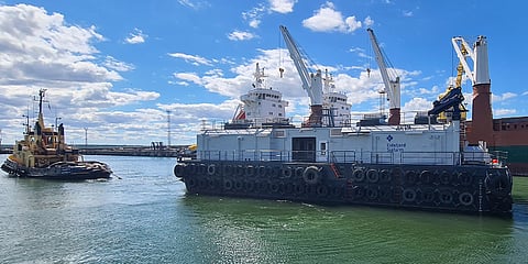 The barge is the fifth in a series to be acquired by the same customer. It has a v-shaped hull with a large bilge keel to withstand rough seas from all sides without compromising stability.