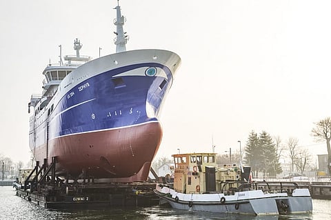 The hull of the 75- by 15-metre Zephyr was built by Marine Projects of Gdansk and is scheduled to arrive at Larsnes Mek Verksted's yard in Western Norway within this week.
