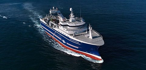 The trawler is crewed by 28 personnel housed in a mix of single and twin cabins and has a fish hold capacity of 1,720 cubic metres. A 2,990kW engine drives a four-bladed, 5,000-millimetre propeller to deliver a maximum speed of 15 knots and a bollard pull of 72 tonnes as well as significantly reduced noise and vibration compared to similar propulsion arrangements. Rounding out the propulsion are a 400kW bow thruster, Hydramarin steering gear, and a high-lift rudder from Becker.