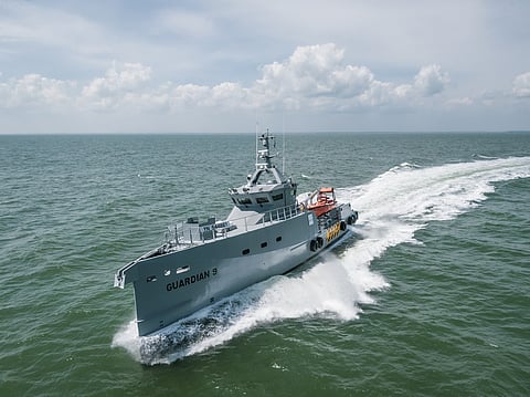The 33-metre-long Guardian 9 (pictured) and Guardian 10 have been configured as patrol boats to assist the Nigerian Navy in providing security for the country's coastal and offshore oil fields.