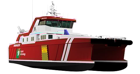 The vessel will have an LOA of 34 metres, seating for 24 passengers, a bollard pull of 30 tonnes, four MTU V200M72 engines, and onboard batteries that may be recharged from shore or from wind farms.