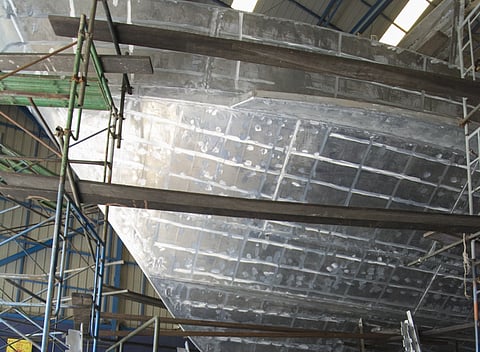 Inside one of Seacrest's weather-protected double building halls the hull and superstructure of a sleek 52- by 7.8-metre tourist dive boat is taking shape.