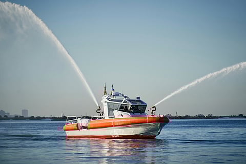 The boat has an LOA of 11 metres, a two-monitor firefighting pump rated at 250 cubic metres per hour, cabin seating for eight crew, and two 50-person liferafts. Two 186kW outboard engines deliver a speed of 32 knots.