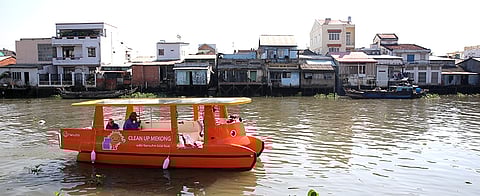 The boats are equipped with conveyor belts to quickly and efficiently scoop up rubbish and other pollutants floating on the surface of the Mekong River, particularly along the stretch of the river that passes through Vinh Long province.