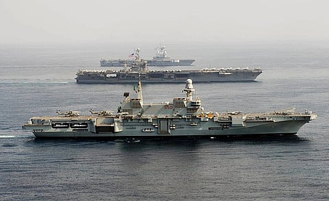 The response from NATO was the early deployment to the Eastern Mediterranean of three Carrier Strike Groups (CSG) led by the Italian Navy's Cavour, operating Harrier fighter-bombers, the French Navy's Charles De Gaulle with Rafale fighter-bombers, and the US Navy's Harry S. Truman, with an air group that includes F/A-18E Super Hornet fighter-bombers and EA-18G Growler electronic warfare planes, with escort provided by surface warships and submarines.