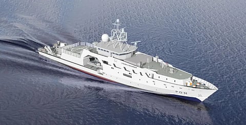 The newbuilding is the first in the navy's Overseas Patroller (Patrouilleur d'Outre-Mer; POM) class. These 80-metre-long ships will replace the navy's older P400-class patrol boats based at France's overseas territories.