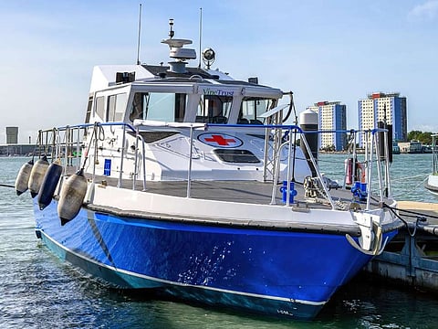 The 16- by 3.1-metre vessel underwent a complete overhaul to enable it to operate as a platform for medical consultations. Other upgrades included the replacement of the generator, the rewiring of electrics, the servicing of the engines, and the installation of new seats and air conditioning. The grey hull and superstructure have meanwhile since been repainted with high-visibility white and blue to reflect its new non-combatant function.