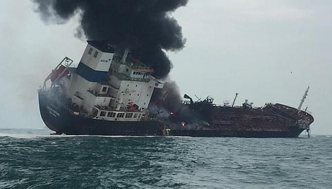 The Vietnamese-flagged Aulac Fortune was refueling from a nearby oil bunkering barge when the blaze erupted on its deck at around 11:30 local time.