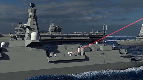 The navy said a burst of high-intensity laser energy fired by the DragonFire system can engage targets such as drones, missiles, and aircraft at the speed of light.