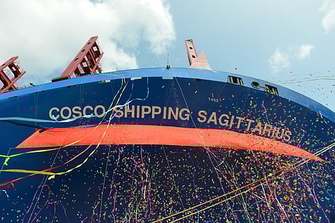 The naming ceremony for COSCO Shipping Sagittarius, the ninth 20,000TEU ultra-large container ship (ULCS) of the COSCO Shipping constellation series, was held at the shipyard of Shanghai Waigaoqiao Shipbuilding on Thursday, October 18.
