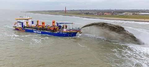 At Den Helder in the Netherlands, the vessel is reinforcing the coastline by placing more than 3.5 million cubic metres of sand in a deep trench just off the coast.