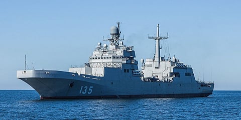 Analysts believe that there are now at least 40 RFN vessels positioned in and around the Black Sea and the eastern Mediterranean. Intelligence reports show that this fleet includes Rapucha-class and Ivan Gren-class amphibious warfare vessels laden with naval infantry and vehicles. There are also three battle groups of frigates and destroyers, headed by the missile cruisers Moskva, Varyag and Marshal Ustinov, together with Udaloy-class destroyers and Admiral Gorshkov-class frigates, and at least four Kilo-class diesel electric powered attack submarines.
