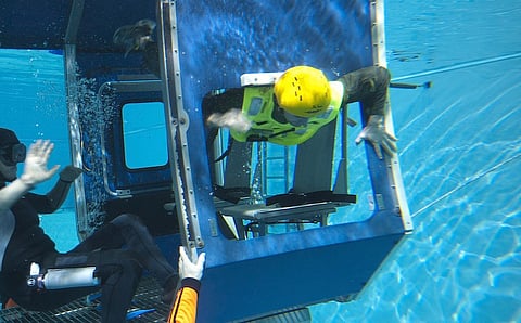 Besides the normal helicopter training that flight personnel have to undergo, those that regularly fly over water are also required to do extra training in the form of underwater escape training.