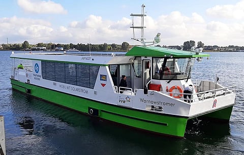 A new catamaran ferry that runs on solar power has begun operational sailings along the Warnow River in the city of Rostock in northern Germany. Named Warnowstromer ("Warnow Streamer"), the inner city ferry was built by local shipyard Ostseestaal while design work was carried out by Ostseestaal subsidiary Ampereship in collaboration with Netherlands-based naval architecture firm Marimecs.