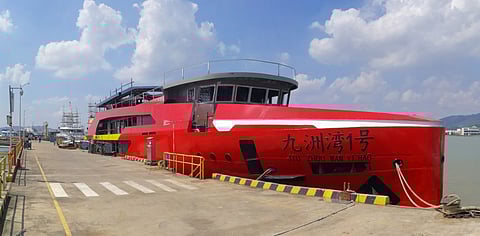 Built by the Aulong Shipbuilding joint venture between Jianglong and Austal, Jiuzhou Wan 1 has an LOA of 62 metres, a beam of 11.6 metres, and capacity for 398 passengers.