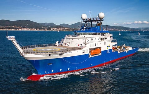 Among the key items of equipment are three multi-beam echosounder arrays totalling 11 tonnes of sonars, 15 other acoustic sensors, a special system for microplastic water assessment, and seven over-the-side launch and recovery handling systems for underwater robots and other tools.