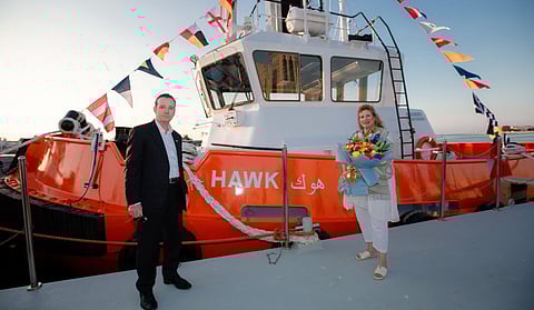 Now operating as part of the RAK Ports fleet are a 19-metre multi-purpose workboat named Hobby and a 19-metre tug named Hawk (pictured). Hobby will be used for general port assistance and buoy maintenance at the Ras al Khaimah Cruise Terminal while Hawk will service barges in Stevin Rock Harbour just outside Saqr Port.